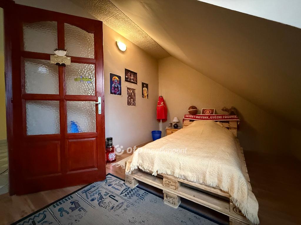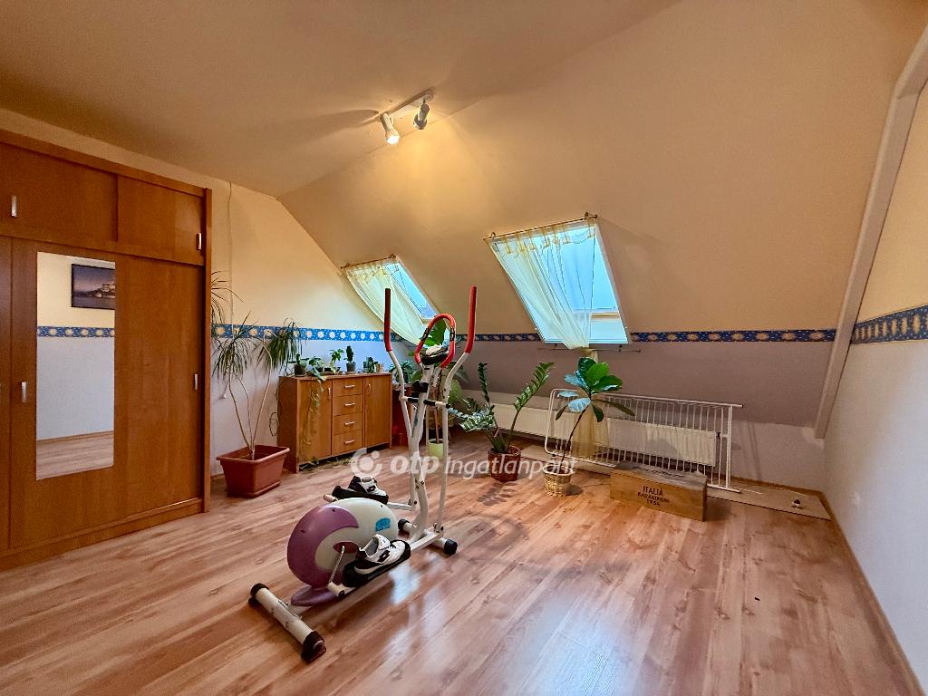 Az emelet szintén jól átgondolt, élhető tereket kínál. Itt négy szobát alakítottak ki, melyek közül kettő teljes értékű, kényelmes méretű hálóként funkcionál, míg két kisebb szoba kiváló lehetőség dolgozószoba, gyerekszoba vagy hobbitér kialakítására. A terek laminált parkettával burkoltak, a szobák tájolása miatt pedig kellemesen világosak. A szinten található egy különálló gardróbhelyiség, amely nagyban hozzájárul a rendezettséghez. A fürdőszoba és a külön WC praktikus elhelyezése biztosítja a család zavartalan reggeli készülődését.